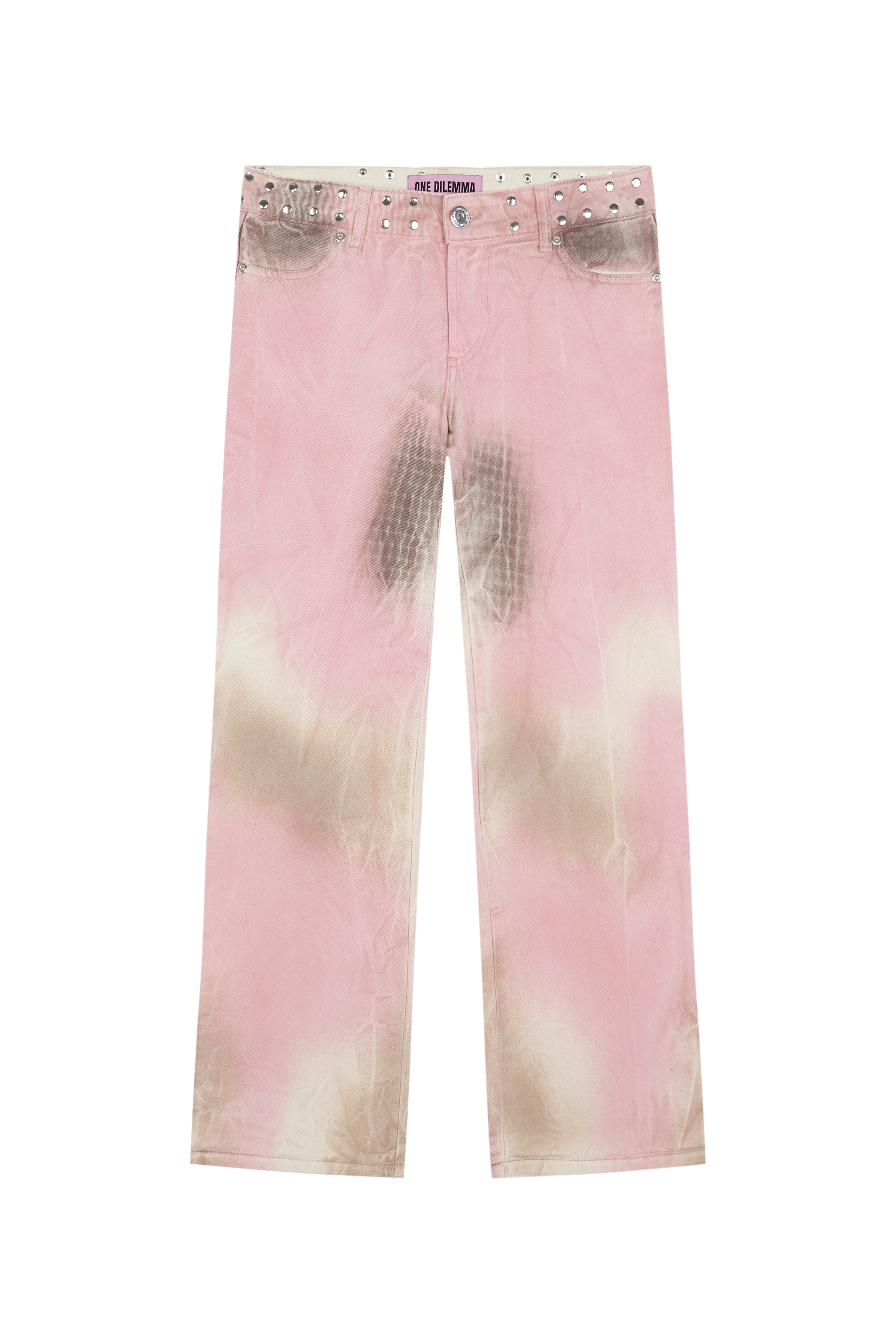 Vaqueros de tiro bajo, con estampado rosa blanco y marrón desgastado con detalles de cocodrilo en la parte delantera del pantalón y en el bolsillo trasero.
