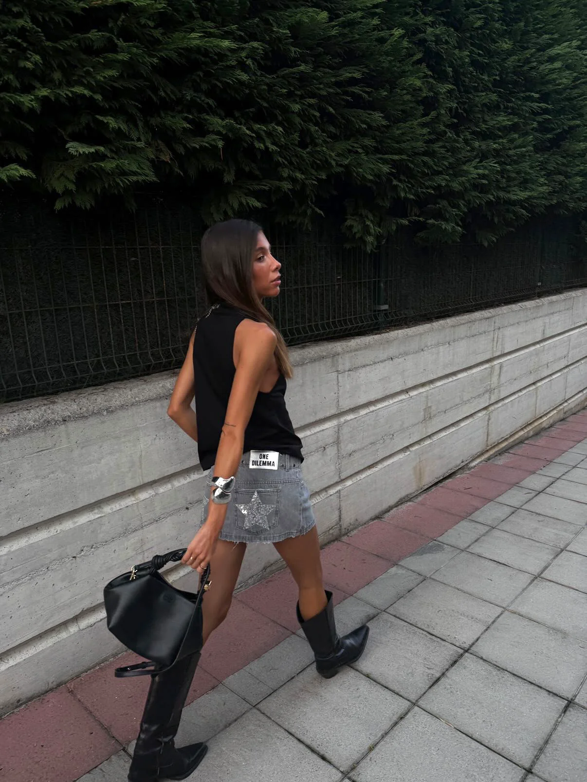Mini-skirt low waist, gris con estrellas plateadas de lentejuelas.